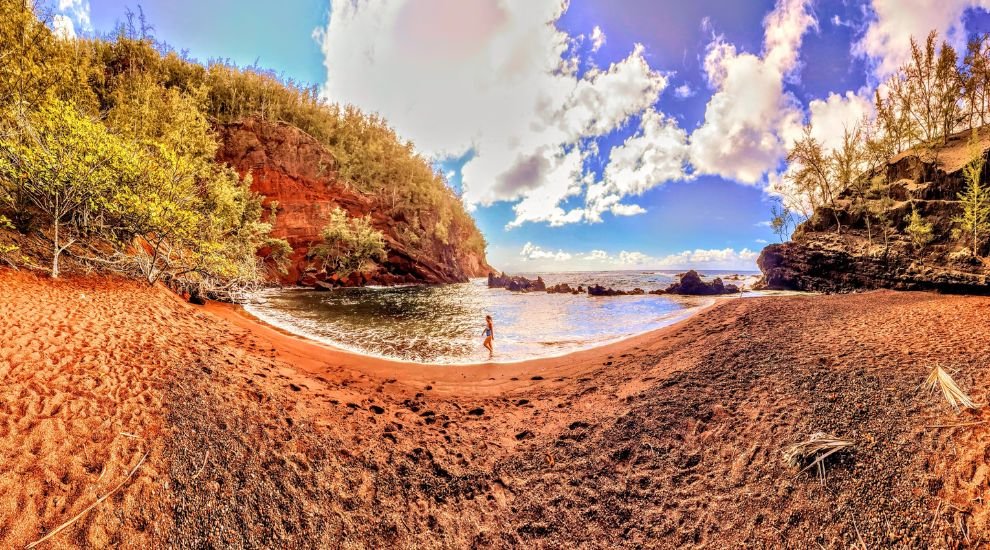 It is located near Hana on the east coast of Maui. The rare red cove of sand is a stunning natural treasure. It’s accessible via a short, rough trail, hidden behind a hill, and offers perfect privacy for sunbathing without clothing. The rusty red sands and the deep blue ocean contrast remarkably, creating a surreal ambience ideal for peaceful, intimate relaxation and tranquil reflection.